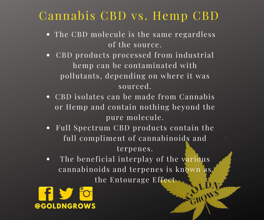 While CBD is CBD regardless of it’s source, CBD is more abundant in Cannabis plants, and the Cannabis plant has a wide range of cannabinoids and terpenes (the aromatic chemicals which give plants their taste, smell, and which are so beneficial in aroma therapy) beyond THC and CBD. This complex interaction of cannabinoids and terpenes is known as the Entourage Effect and it has been shown to increase the effectiveness of Cannabinoids like THC and CBD. While Hemp also has trace amounts of THC, other cannabinoids and terpenes, their concentrations are far lower.